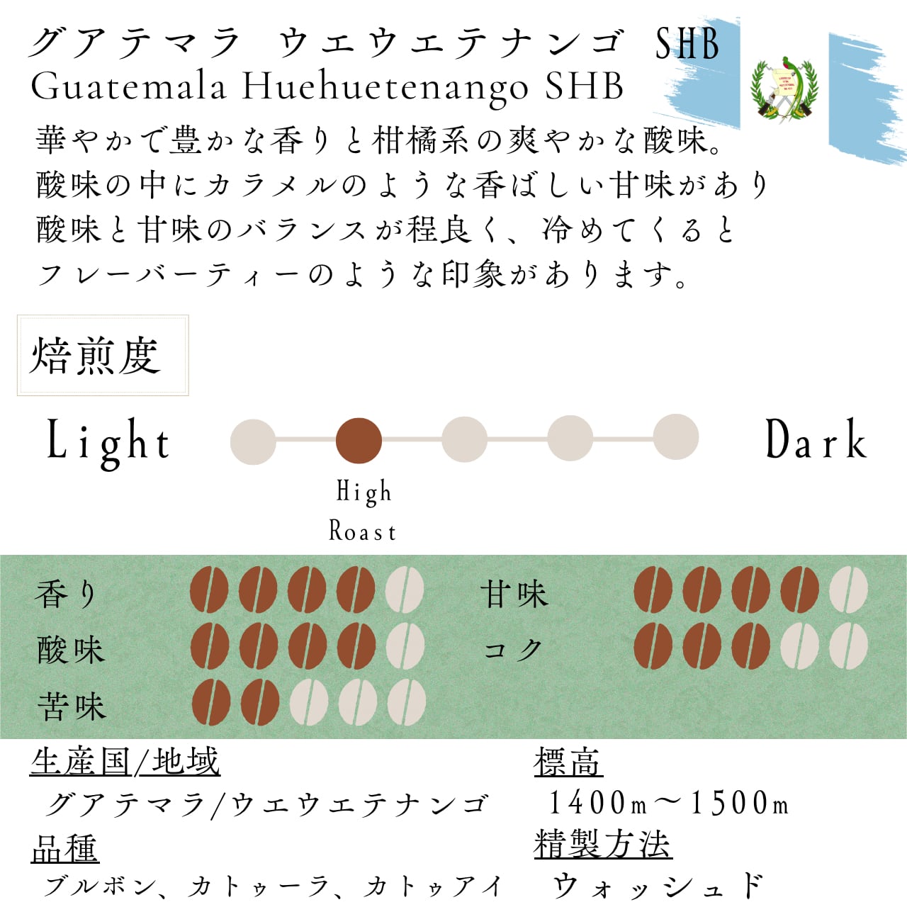 グアテマラは中米にある国で、産地の標高によって生豆のランク付けがされ、一般的に標高が高いほど良いとされています。